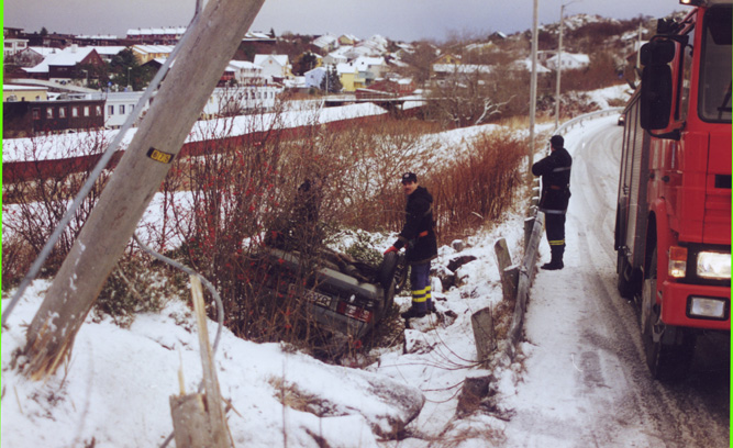 Her har brannvakta rykket ut til et bilvelt i Vesterveien en gang på slutten av 1980 tallet. Bilen hadde mistet kontrollen og brast gjennom autovernet og knekt stolper , men det gikk bra med føreren. Som vanlig er brannvakta raskt på pletten og rydder opp ved slike ulykker .