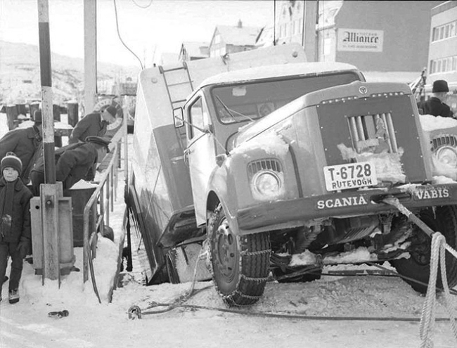 Vi får tilsendt mange bilder fra før i tiden der avsender og fotograf ikke er påført. Her er et slikt fra den gangen fergekaia lå rett ut for Nordmørskafeen, og hvor "mjøkrutå" har havnet i havet fra fergelemmen på et eller annet vis. Når bildet er tatt er ukjent, men tipper midt på 1960 tallet en gang.