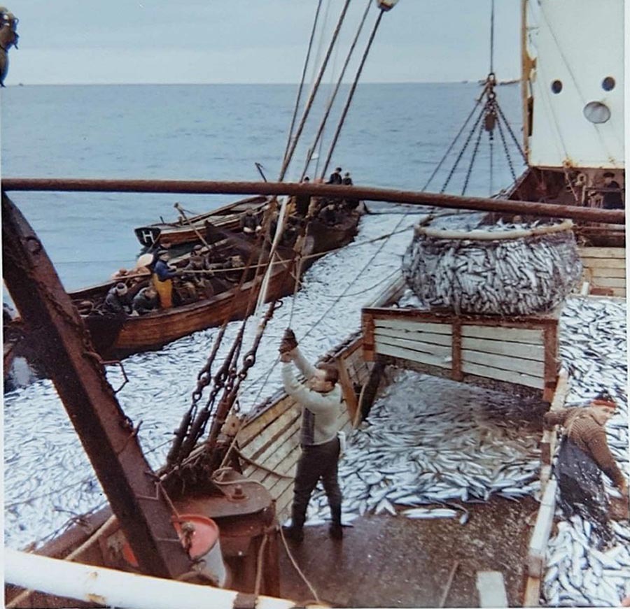 Fra dekket på " Møretrål 2" der de tar inn sild. På bilde der nede til venstre står min far som var maskinist om bord. Hjalmar Andersen fra Kviby i Alta. Han til høyre vet jeg ikke hvem er men kanskje noen vet ?( Foto fra Leif Andersen)