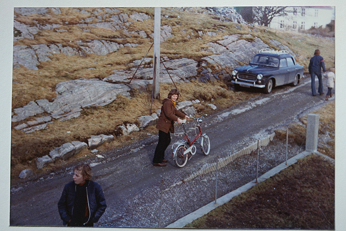 Til venstre Nikolai Skomsøy, Jørgen Øksenvåg med DBS kombisykkel og trolig Tore Dyrnes som leier på et barn. Bilen er Alf Skomsøy sin Peugeot. Det er lenge siden dette. 35 år..huff og huff.