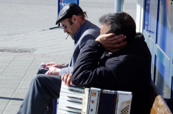 Et lite glimt fra et par år siden da rumenske trekkspillere stod over alt og prøvde å få inn noen kroner. Han her ser ut til å ha gitt opp, mens "Tyske slagere" som typen i bakgrunnen faktisk kalles , tar opp en hundrings fra lommeboka.( 2006)
