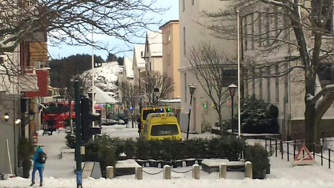 Fra Skolegata der biler fra redningsenheter er plassert. ( Foto: Hilde Angvik)
