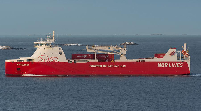 M/S Kvitbjørn, 120 x 21 x 4,8 m., Ro-Ro/Cargo skip,(containere på dekk), bygd I 2014, seiler med Færøysk flagg, tilhører rederiet Nor Lines med hovedkontor i Stavanger. Powered by Natural Gas (LNG) og karaktirisert som ”Verdens mest miljøvennlige godsskip”,,. Bygget ved Tsjui Heavy Industris Co. Ltd., i Qingqing Wu, Kina, Jomfruturen var 16 april. 2014, Skal trafikkere strekningen Holland, Tyskland, Oslofjorden og langs Norskekysten til Hammerfest. Den passerte utenfor byen søndag ettermiddag og gikk med 16 knops fart og skulle til Ålesund. Her i Ramnfjorden nord av Kristiansund. ( Foto: Tom Einar Felberg)