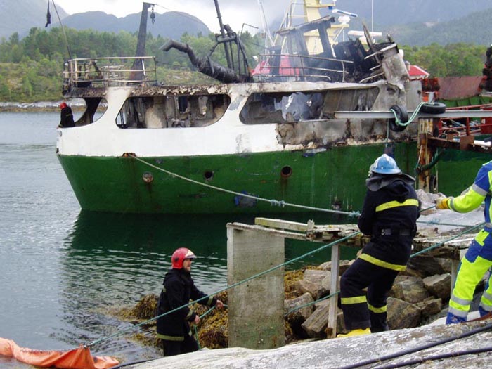 Her i 2004 da skipet het " Freitind" og brant på Tustna. ( Foto: B. O. Angvik)