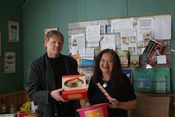 Inger Daniloff fra Storskarven solgte loddene . Her Bjørn Ove med kaken. (Foto: Wenche Horne)