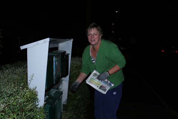Anna Bae har levert Tidens Krav i Brunsvika i 3-4 år forteller hun og haster videre nedover veien her ute mens alle sover. I drittvær og storm er dette litt av en annerledes jobb.