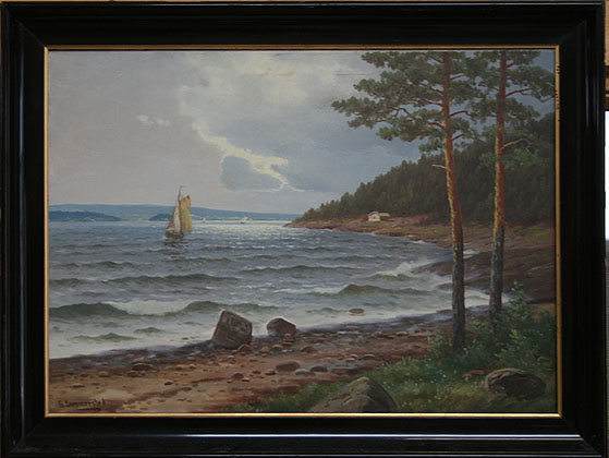 Onsdag var det kommet inn et flott maleri ute i Gjenbrukshallen til kommunen. Den som skjønner seg på kunst så at dette var malt av en som virkelig kunne å traktere penselen. Det var malt på lerret, og så ut til å være et motiv fra fjordene på Østlandet.