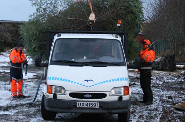 Til Innlandet En av grantrærne som stor nedenfor Baldersvei, ble kappet og kjørt vekk på mandag. Dette treet skulle til Dødeladen på Innlandet.