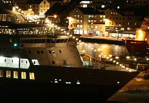 Hurtigruta inne på havna i den skarpe vinterkvelden. (boa)