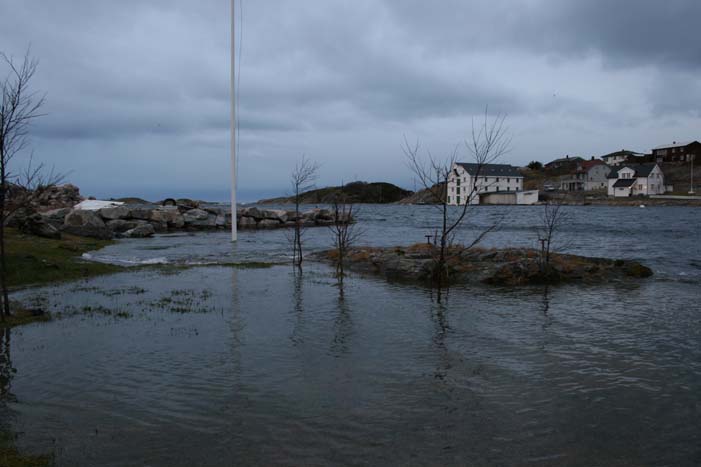 I middagstiden var sjøen langt opp på hagen her i Storskarven.