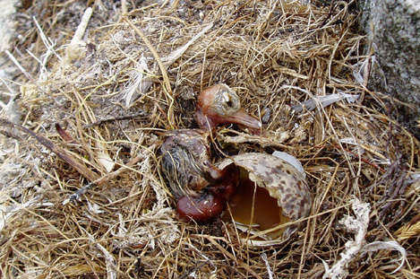 Denne krykkjeungen gikk rett vest i år. Det så ut til at den har blitt klekket ut i varmen, men at alle foreldre hadde forlatt holmen med større flyvedyktige unger. Stedet er på Treskoholmen rett ved Revhammeren. Fugleverden kan være rå nok.