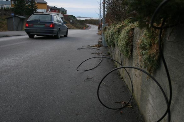 Ute i Karihola ligger ledningene til Kabel-TV i hulter og bulter fra en boks og langs hagemurene. Det virker sikkert slik, men det er slik vi så ledningene i Istanbul i fattigkvarterene en gang i tiden, Da var det gjerne 500 ledninger som lå slik. Unødvendig i 2006.