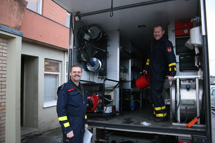 Brannmester Rolf A. Magerøy (t.v) og konstabel Svein J. Dahle fra Molde Brannvesen tok turen til Kristiansund på røde rappen for å ordne opp i vannlekkasjen. -At brannvesenet her i Kristiansund ikke ville ha denne tjenesten, når de fikk tilbudt bilen,- forstår vi ikke noe av sier de til BN. (Noen har vasset i graut her, så skyld ikke på Molde. red anm.)