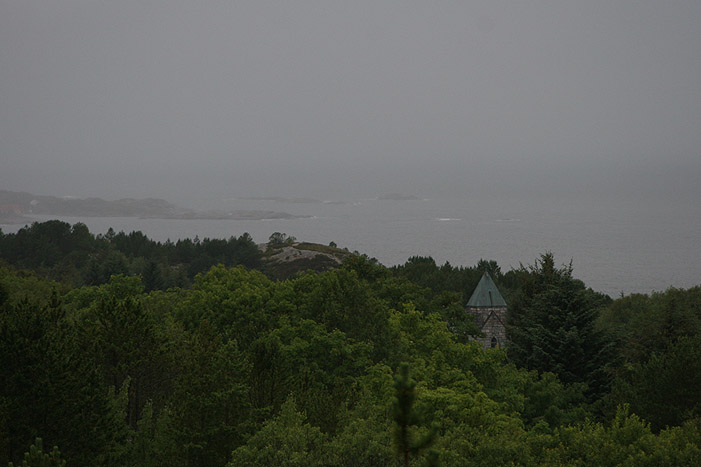 Dårlig sikt i regnet. Snart blir vel ingen ting å se på grunn av alle trærne som vokser i tillegg. Kapellet på Kirkelandet og Averøya i bakgrunnen.