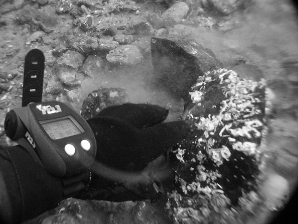 Frank Karlsen ser på en kullbit som fantes nedover i mengder mot dypere hav.