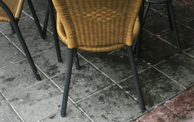 Det er ikke pent ved Fishan-bua. Fettet har merket hellene svart under stolene, og det oser brent fett.