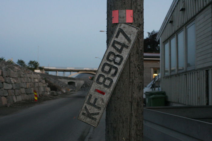 Noen har mistet dette bilskiltet ved gamle brusfabrikken ute i Hagelin. Det henger på stolpen ser vi nå i kveld. Skulle være lett å finne eieren her.