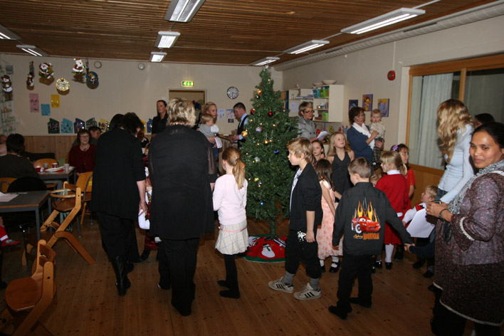 Her synges julesanger og barn og foreldre går rundt juletreet. Fin markering at julen nærmer seg.