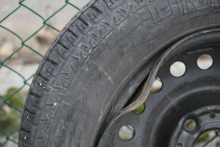 Gjennnom kant og plen + rett over fortauet. Felg og dekk er ødelagt. Hele hjulet ble bare satt der.