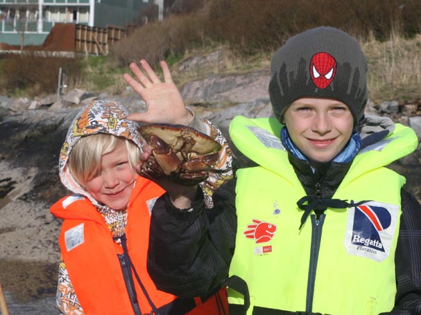Det var stor stas dette her å få en så stor krabbe. F.v Elias Skjølberg Hunnes og Kristian Roksvåg Nielsen. Etterpå har vi hørt at krabben ble kokt, og at den smakte bra.