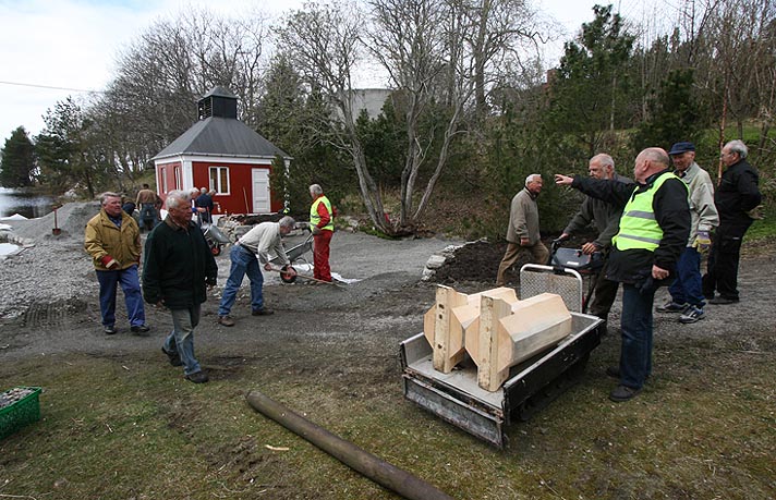 Her lages stand til benker ved ytre damhus. En engasjert gjeng jobber på spreng.