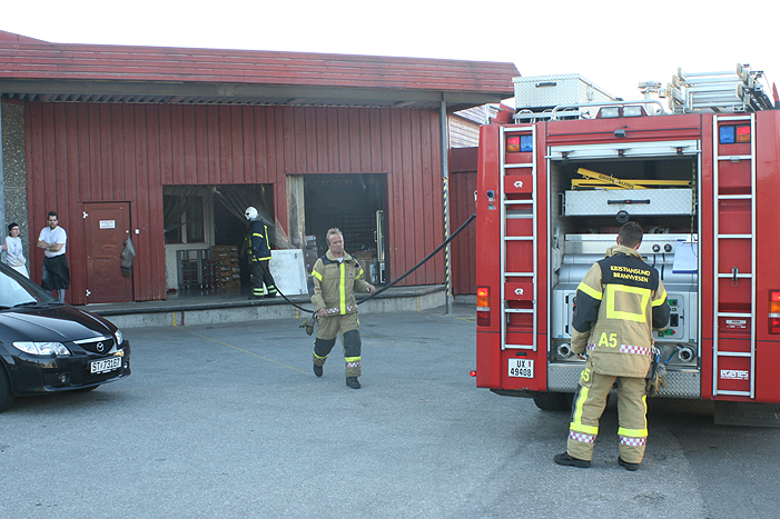Brannvesenet er kommet og går inn med høytrykkslange. Det viste seg at det var brann i en bakeriovn.