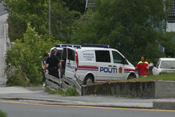 Ambulansepersonell kom med politibilen til uhellstedet, og de kjørte han til sykehuset. Trolig skulle dette gå bra, da den skadde selv gikk inn i bilen etter at nakke-støtte var montert.
