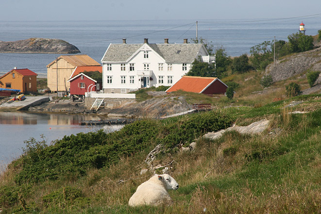 Sauen med Strømsholmen Dykkersenter i bakgrunnen.