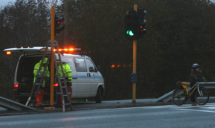 I kveld er folk fra kommunens verksted ute ved lyskrysset ved Slakteriet på Wilh.Dalls. De holdt på med noe ledningsgreier får vi vite.