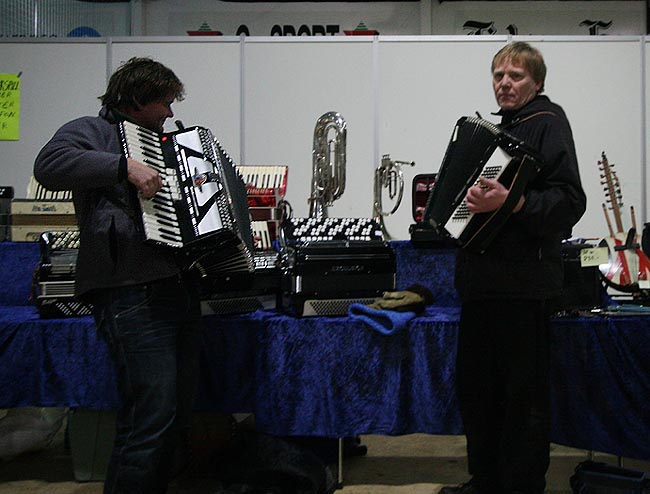 Øystein Blåsvær (t.v) og Bjørn Ove Angvik laget en liten konsert med russiske folkemelodier sånn i farten ved bordet til han som solgte trekkspill. (Foto: John Kuløy)