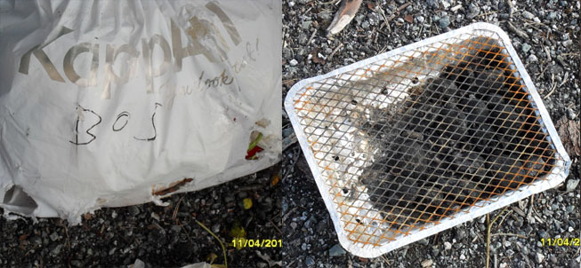 Søppel har blitt hensatt og fugler og dyr har kastet søppelet utover på jakt etter matrester. Et gammelt bildekk har også blitt dumpet her. Ettersom de skyldige tydeligvis ikke har fått med seg at gamle dekk kan leveres gratis hos dekkforhandlere, så er det opplagt at det er rånere som har vært på ferde.: Det hjelper ikke å pakke ned søppelet i poser og merke dem med "BOS" når man ikke har til hensikt å ta det med seg. Feilstavingen av det enkle ordet "boss" er enda et tegn på at det er rånere som står bak forsøplingen. Engangsgriller lå det flere av rundt omkring her. Jeg begynner å bli tilhenger av det tidligere forslaget om å forby slike.