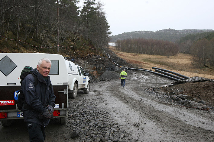 Østover fra Gløsvågdalen mot Sandvika er arbeidet begynt å ta ut løsmasser. Vi ser at tilførselsveier er kommet på plass. Bare det er et omfattende entrepenørarbeid.