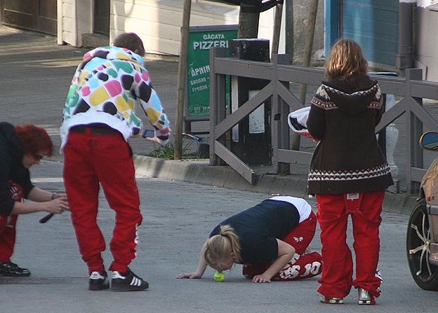 Russen holder på med sitt i bygater, rundkjøring, Vanndamman og andre steder også. I kveld var det ei jente som skulle trille en tennisball med nesen fra Kaibakken og opp til Skolegata så det ut til.