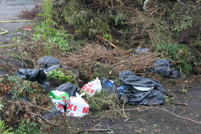 En bønn fra renovasjonen: Ikke kast sekker med hageavfall på dyngen. Ta ut innholdet og legg sekkene eller annen plastemballasje i dunk på stedet.