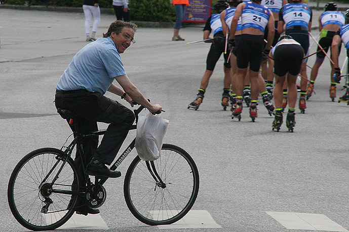 Her henger han seg sannelig på rulleskikonkurransen på sykkel. Bra Harald !