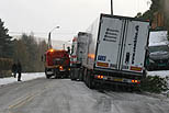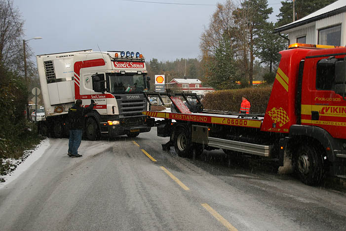 En dansk trailer skled av veien ved Rensvikkrysset ved 16 tiden. Viking fikk den på veien etter en tid.