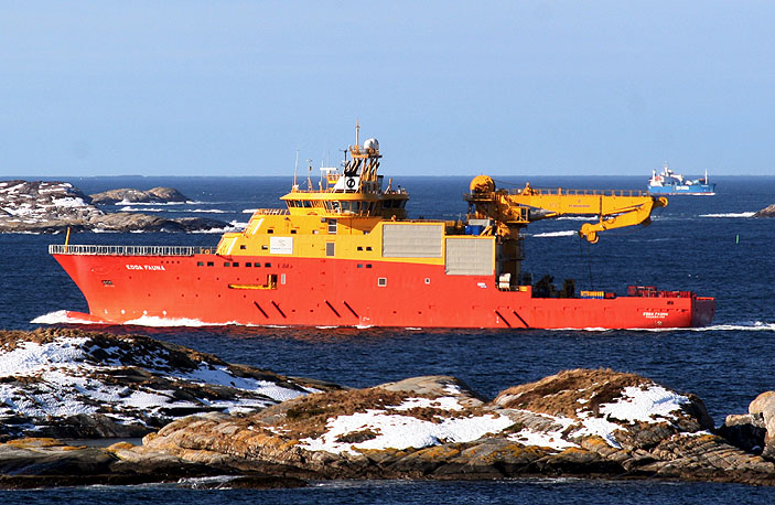 "Edda Fauna" med sin knalloransje skuteside lager krøll på fargegjengivelsen på bilder. Langt bak "SC Aberdeen"å vei nordover leia.