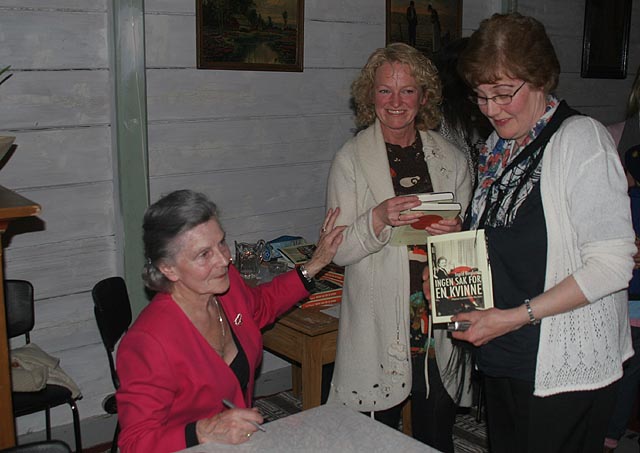 Mary Tøvik Reklev har skrevet bok om sitt liv som kvinnelig etterforsker, og Liv Roksvaag(t.h) tok med boken hun kjøpte i fjor for å få den signert. I midten Oddrun Skarvøy Sørvik.