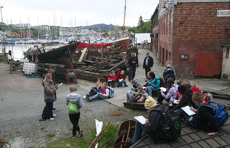 Hva lager en bødtger? Eller hva brennes i en kafé innerst i Vågen. Elevene hadde svart skriftlig på spørsmål om lokalhistorie for de foskjellige bydeler. Her går lærerne gjenneom svarene sammen med en klasse ved slippen på Mellemværftet. Det skrytes også av sundbåtsafarien, hvor sundbåtvesenet har laget spørsmål fra rundturen som elevene kan svare på. Bra tiltak !