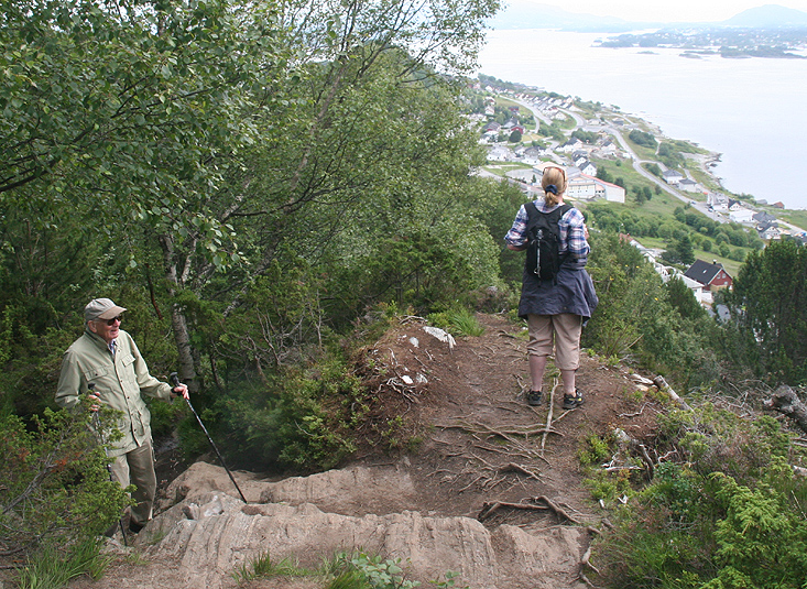 Det er egentlig "joggeskoføre" opp stien. Her like før tregrensen. Utsikt innover Hessafjorden mot Langevåg. Karen til venstre er 83 år og tok en treningstur et stykke oppover.