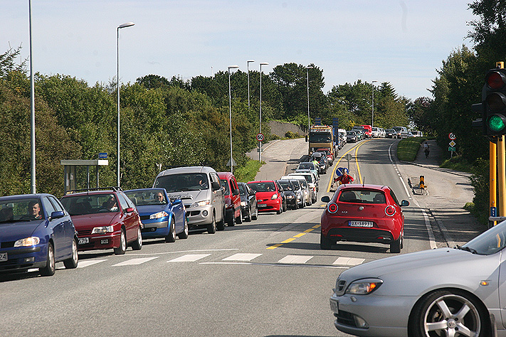 Veien var stengt ved rundkjøring Statoil. Et felt var åpent og der skulle en stakkars politimann sluse gjenneom den voldsomme trafikkmengden. Køa gikk helt til Løkkemyra ble det sagt her. Det går da ikke an å stenge en hel by var det flere som gå uttrykk for.