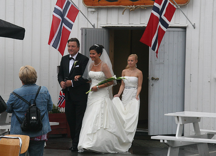 Her kommer far Hoseth ut fa brygga med Kristin på vei opp mot alteret som var laget ute på kaia.