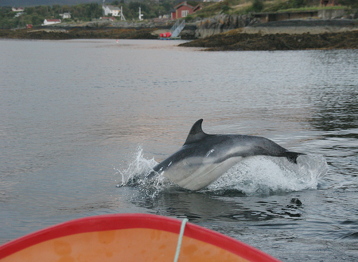 Det var en fin kveld her ute ved Vevangstraumen. Noen barn kom til etter hvert som ryktet spredde seg at delfinene var dukket opp.