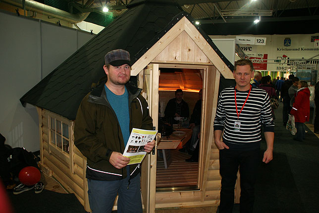 Slike grillhytter gikk virkelig unna i helga. Lars Kåre Tømmervåg (t.v) har nettopp bestilt en slik for å ha på hytta av selger Gjøran Antonsen. Mulig det ble solgt neste 50 slike hytter.
