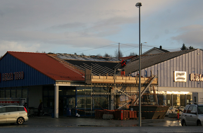 På Lidl-bygget , nå Rema 1000 holder arbeidere på å reparere taket etter orkanherjinger.
