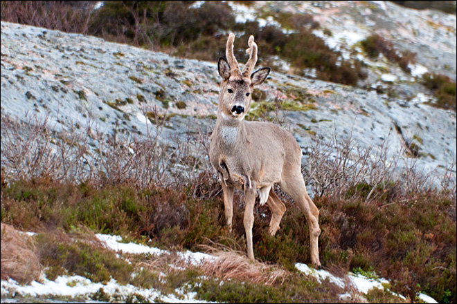 Livet går sin gang – selv om vi fortsatt ikke har fått oppleve det en forbinder med vår. I dag tidlig spankulerte denne bukken omkring på Gjeldneshaugen ovenfor Storskarven i Brunsvika og fant seg ett og annet å beite på.