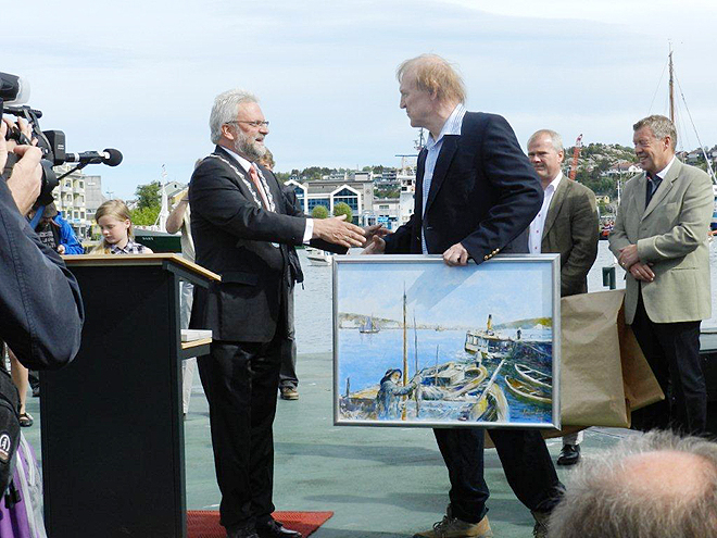 Ordfører Per Kristian Øyen var ute med ordførerkjedet for tredje dag på rad på noe positivt for Kristiansund. Her takkes pådriver for Framnæs-prosjektet Trond Myrhaug.( Foto: John Kuløy)