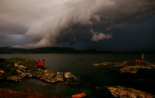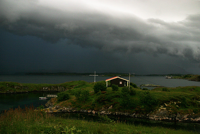 Her kommer tordenværet. Bildet tatt fra Atlanterhavsveien i retning mot Averøya. Det ble mye regn som kom nordover kysten med denne fronten, og det sluttet ikke å regne før i halv ett tiden natt til mandag.