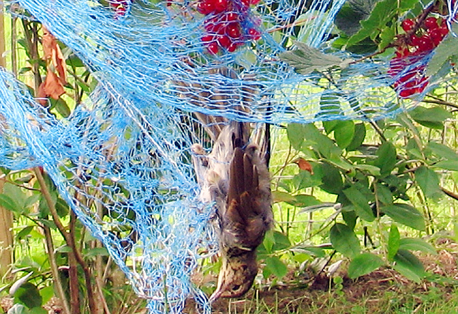 En trist liten historie i nettet under ripsbærbuskene. Hva slags fugl det er som ble fristet er ukjent. (Foto: Wenche Horne)