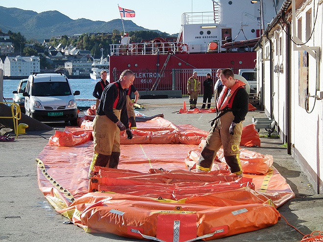 Brannvesenet som disonerer oljevernutstyret for Nordmøre var ute og prøvde et koggersytem for oljelenser på havna i dag. Hele 300 meter er pakket sammen i nærmest "trekkspillforrm" og kan settes på sjøen på et øyeblikk. Neste uke blir det en storøvelse innen oljevern i Kristiansund, der tyngere enheter fra Midt-norsk oljevern deltar .